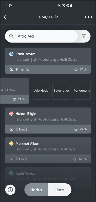 By tapping on the device cards, you can view the location of the vehicle on the map and details about the vehicle.