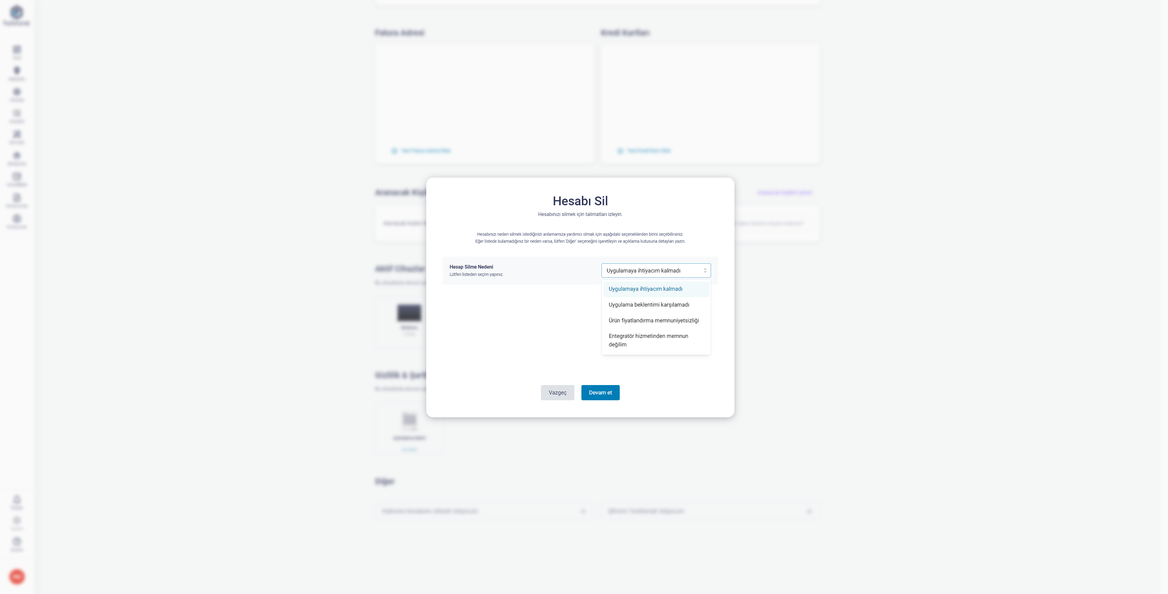 Hesap Silme işlemini tamamlayabilmeniz için lütfen bir Hesap Silme Nedeni seçiniz ve devam et butonuna tıklayınız.