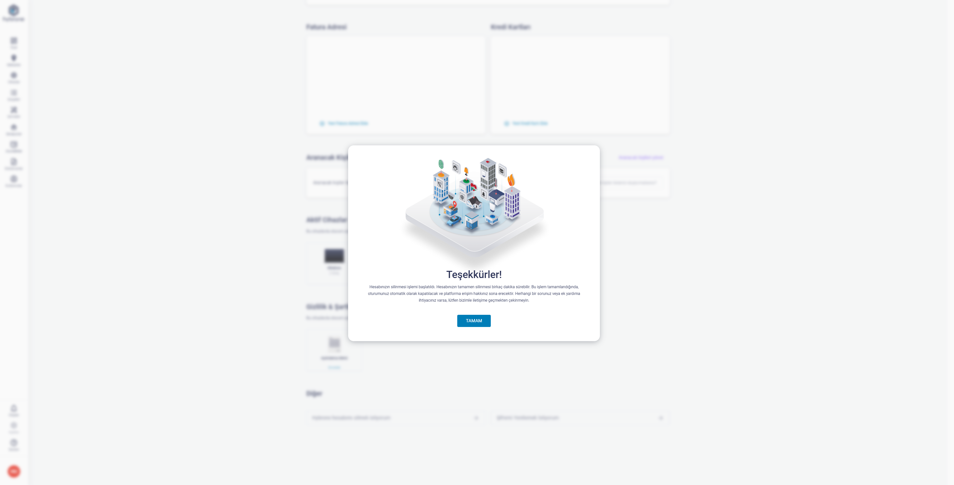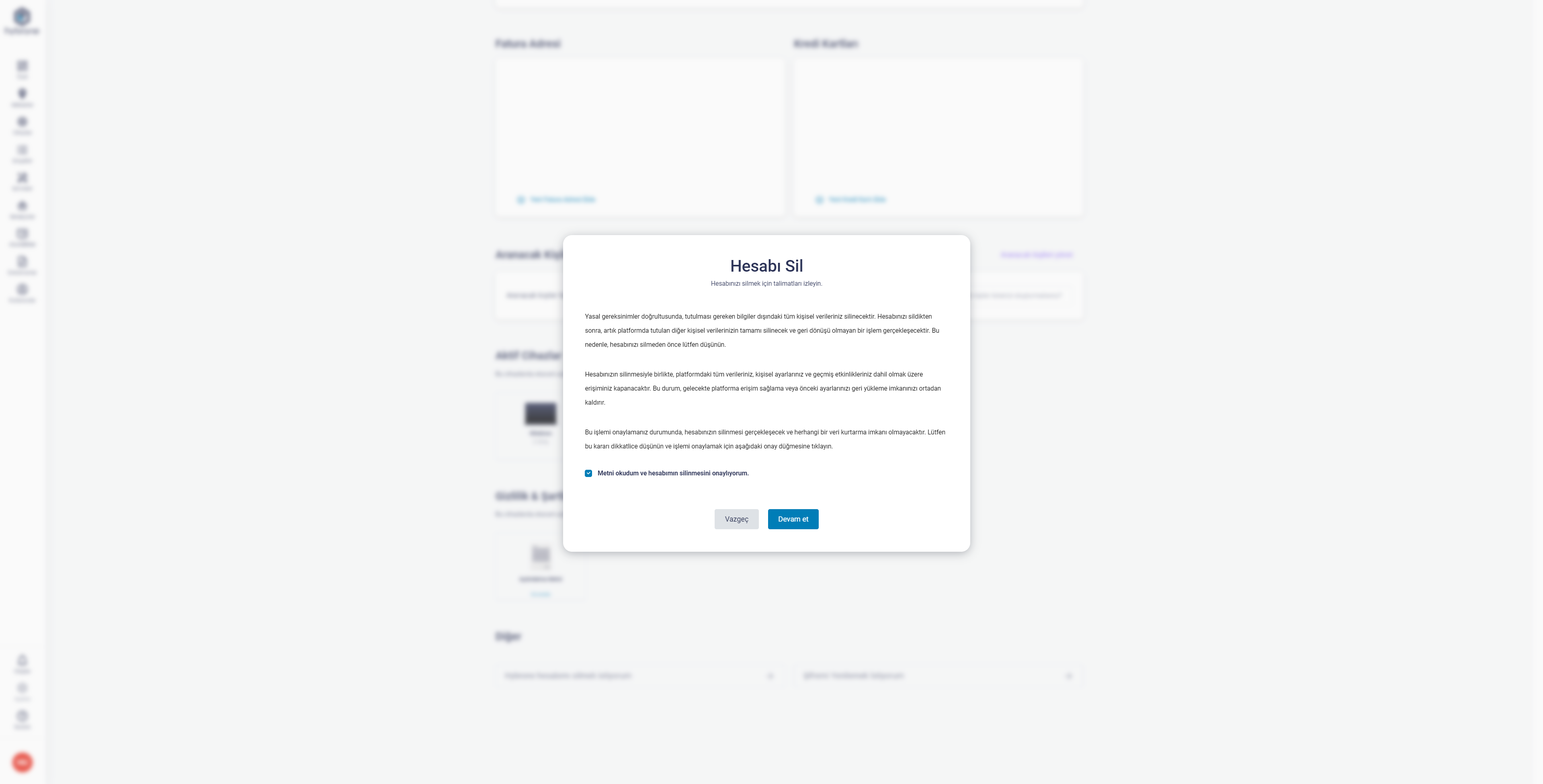 Yasal gereksinimler doğrultusunda, tutulması gereken bilgiler dışındaki tüm kişisel verileriniz silinecektir. Hesabınızı sildikten sonra, artık platformda tutulan diğer kişisel verilerinizin tamamı silinecek ve geri dönüşü olmayan bir işlem gerçekleşecektir. Bu nedenle, hesabınızı silmeden önce lütfen düşünün. Hesabınızın silinmesiyle birlikte, platformdaki tüm verileriniz, kişisel ayarlarınız ve geçmiş etkinlikleriniz dahil olmak üzere erişiminiz kapanacaktır. Bu durum, gelecekte platforma erişim sağlama veya önceki ayarlarınızı geri yükleme imkanınızı ortadan kaldırır. Bu işlemi onaylamanız durumunda, hesabınızın silinmesi gerçekleşecek ve herhangi bir veri kurtarma imkanı olmayacaktır. Lütfen bu kararı dikkatlice düşünün ve işlemi onaylamak için aşağıdaki onay düğmesine tıklayın.