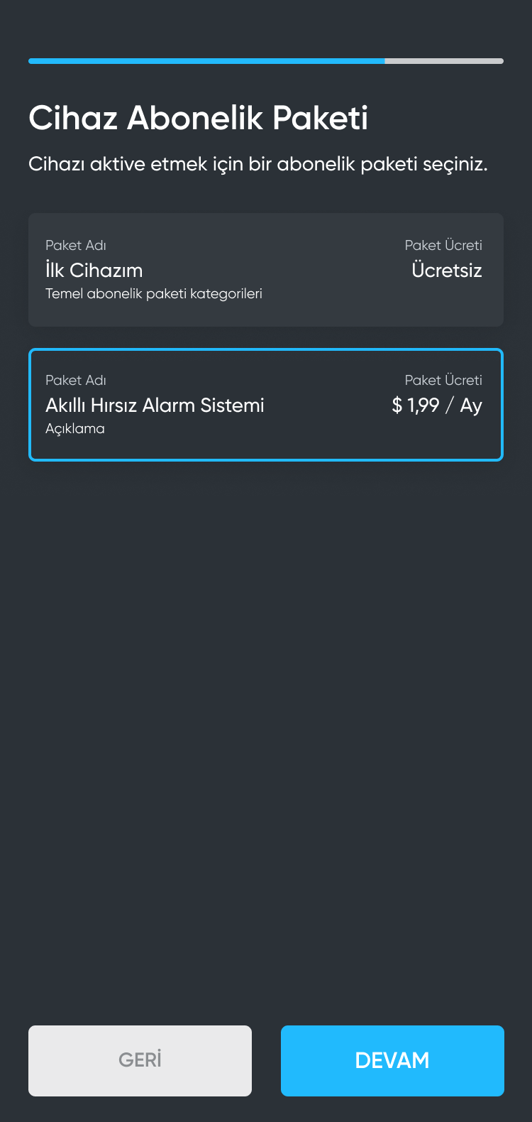 Cihazınız başarıyla eklenmiştir, bir sonraki adımda abonelik paketinizi seçerek devam ediniz.